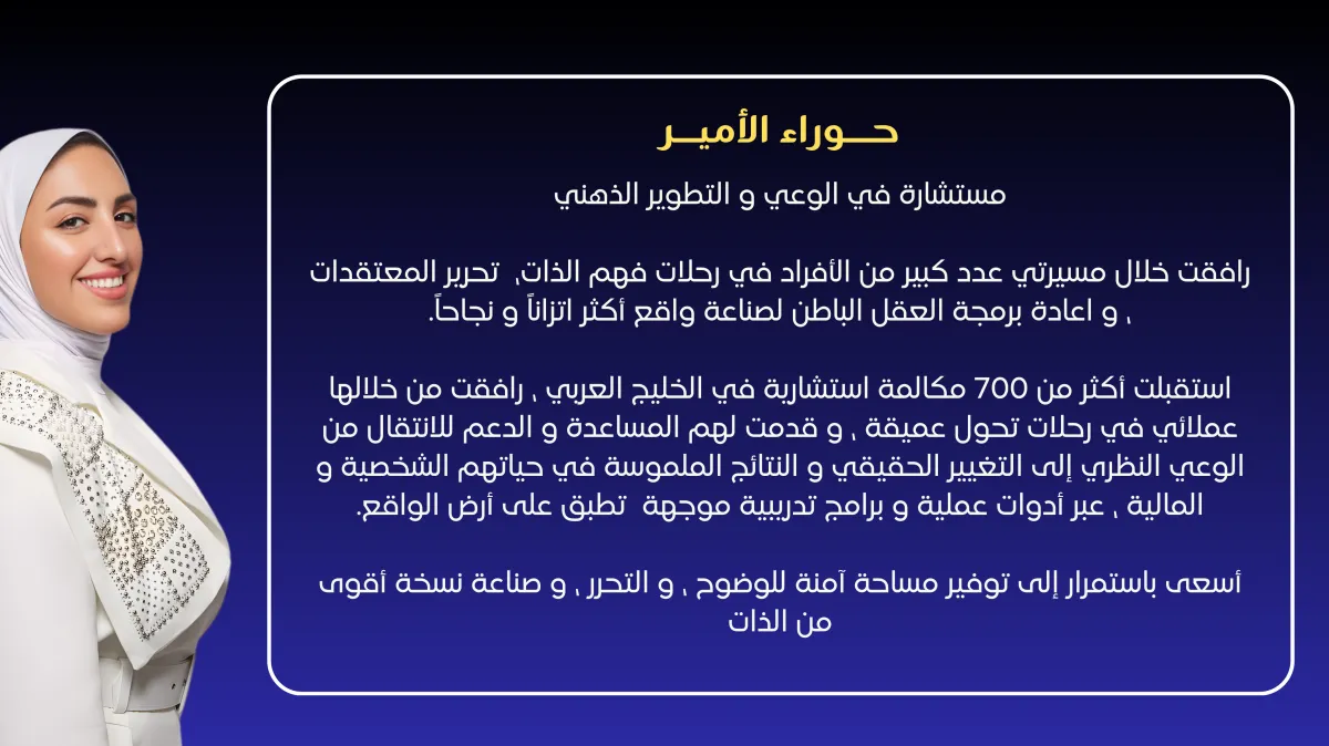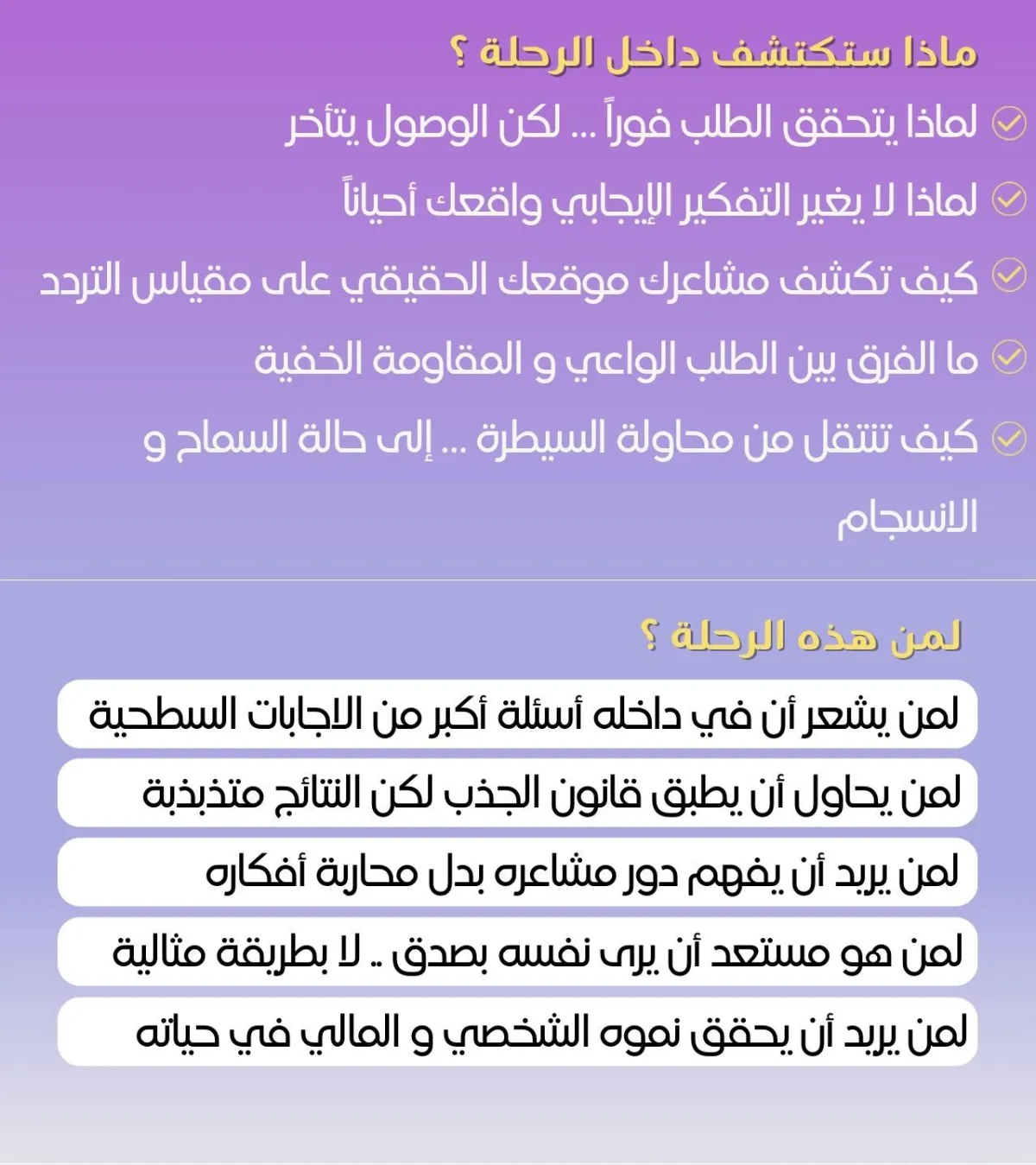 مساحة مخصصة لاستقبال الأسئلة و الإجابة عليها بعمق و وضوح ، لضمان أنك لا تخرج بأي نقطة غير مكتملة